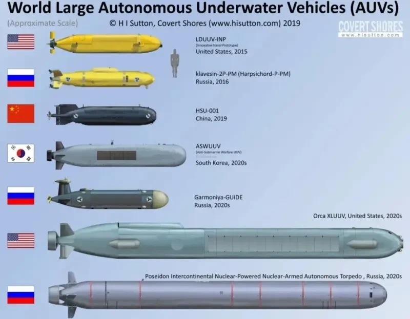 Кроме того, носители АНПА «Посейдон» подвержены тем же угрозам, что и российские РПКСН – в момент нахождения у пирса они крайне уязвимы к нанесению противником внезапного обезоруживающего удара, причём как ядерным оружием, так и конвенциональным. Более того, с учётом опыта проведения специальной военной операции (СВО) на Украине нельзя исключать и диверсионных действий в мирное время, проводимых, например, с помощью безэкипажных катеров (БЭК) камикадзе.