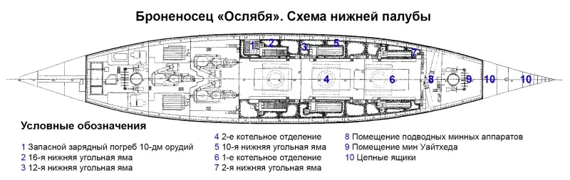 Схема №5. Броненосец «Ослябя». Нижняя палуба