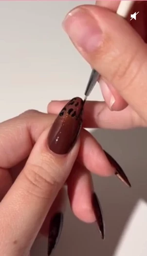 Нарисуйте пятнышки. Окуните тонкую кисть в черный лак и нанесите на кончики ногтей небольшие пятна, создавая эффект леопардового узора.