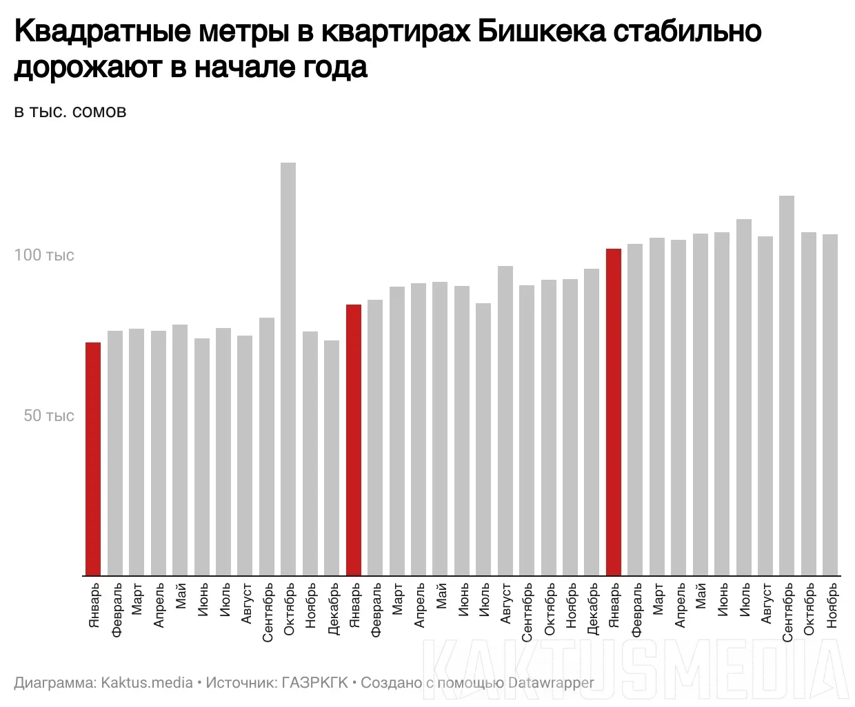 В текущем году цена квадратного метра жилья в Бишкеке возросла на 15%. С ноября прошлого года, когда стоимость составляла 92 635 сомов, сейчас она достигла 106 607 сомов, согласно данным Госагентства по земельным ресурсам, кадастру, геодезии и картографии (ГАЗРКГ). Однако за последние два месяца в столице произошло снижение цен на квадратный метр после пиковых значений, зарегистрированных в сентябре.