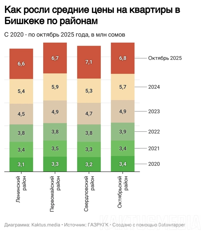 Согласно данным за октябрь, средняя цена квартир в Свердловском районе составляет 7 млн сомов, в Октябрьском - 6,8 млн сомов, в Первомайском - 6,7 млн сомов, а в Ленинском - 6,6 млн сомов.