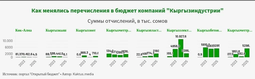 What is happening with the holding now? Is it operational? It is difficult to answer this question, as there is no official data on new productions or reports on current activities.According to information from the Ministry of Finance, "Kyrgyzindustry" continues to operate, but its activity has decreased since its establishment. Over four years, contributions to the budget decreased from 19 million soms in 2002 to 2 million in 2025.