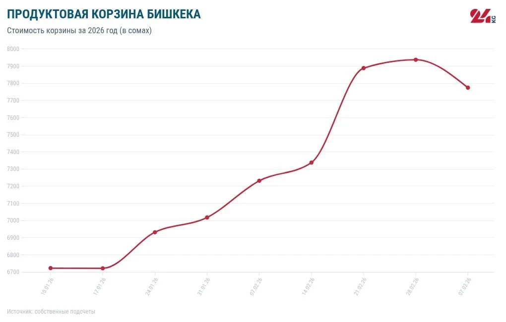 According to our analysis, since the beginning of our experiment in late October 2018, the cost of the grocery basket has increased by 4,504 soms. Since the beginning of this year, it has risen by 1,051 soms, and compared to the same period in 2025, it has increased by 1,712 soms.