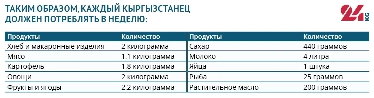 The nutritional standards for citizens of Kyrgyzstan were approved by the government in 2009. According to this document, each citizen should receive nine types of products monthly.