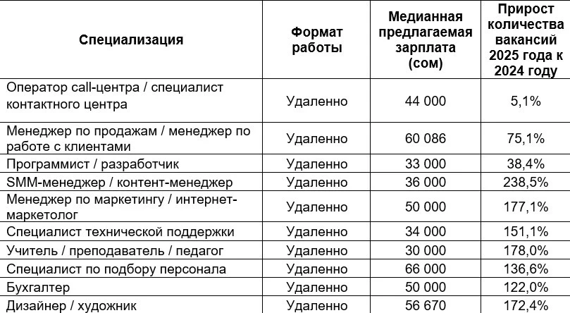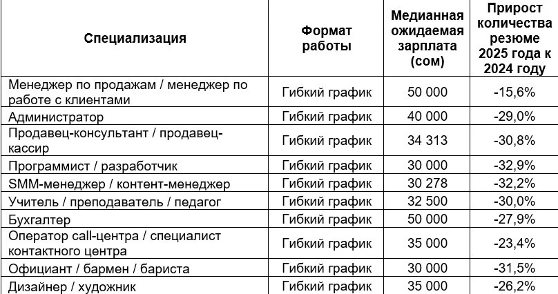 *The median salary is a more accurate indicator than the average income, as it does not distort data caused by extreme values and shows the central tendency.In 2025, flexible schedules were most common in mass and service professions. The largest increase in vacancies was observed among call center operators (+148.8%), cooks and bakers (+115.8%), as well as SMM and content managers (+103.5%). This indicates an expansion of flexible employment forms both in the service sector and in digital professions. The highest median salary was noted for couriers (72,268 soms), while the segments of trade, education, and administrative positions showed moderate but stable demand.