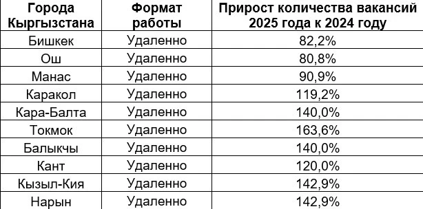 In 2025, remote work on headhunter.kg shows significant growth in all cities of Kyrgyzstan. The leaders in dynamics were Tokmok (+163.6%), Kara-Balta and Balakchy (+140.0%), as well as Kyzyl-Kiya and Naryn (+142.9%). This indicates an expansion of remote employment beyond major cities and a reduction in territorial restrictions for employers and applicants.