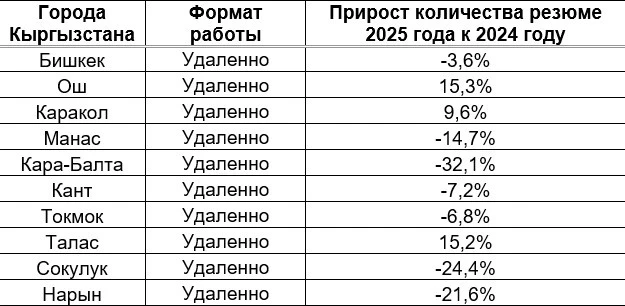 In 2025, there is a decrease in the number of resumes with remote schedules on headhunter.kg across all cities in Kyrgyzstan. The smallest decline was recorded in Bishkek (-4.3%) and Osh (-7.8%), while in other cities the drop reached 15–20%. This data indicates an overall decrease in applicant activity in the field of remote work, regardless of the region.