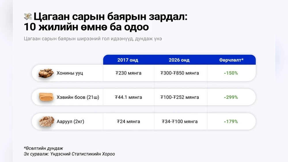 Comparing to 2017, it can be observed that prices for traditional dishes on the table during Tsagaan Sar, such as uuts (mutton back), hevyeen boov (Mongolian cookies for decorating the festive table), and aaruul, khuruud (traditional dried curds), have significantly increased. For example, the price of uuts has risen by 150% over the last 10 years and now ranges from ₮300 to ₮850 thousand (from $85 to $240), the cost of 2 kg of aaruul has increased by 179%, ranging from ₮34 to ₮100 thousand (from $10 to $28), and the price of hevyeen boov has risen by 299%, varying from ₮100 to ₮252 (from $28 to $71). This means that the price of hevyeen boov has nearly tripled, uuts has increased by 2.5 times, and aaruul has risen by 1.8 times.