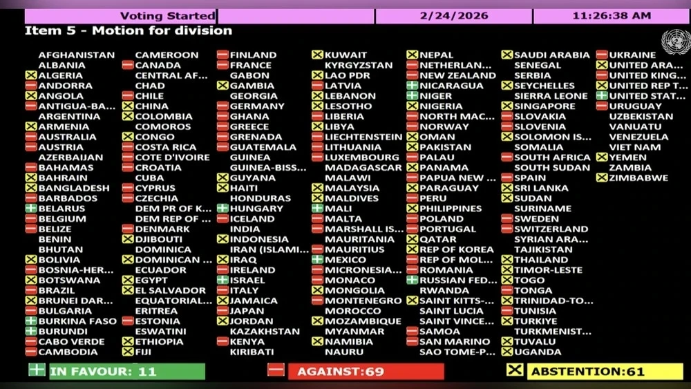 On the day of the fourth anniversary of the start of Russia's full-scale invasion, 69 countries voted against Washington's initiative to exclude the principles of sovereignty and territorial integrity from the text, while only 11 countries supported the US position.
