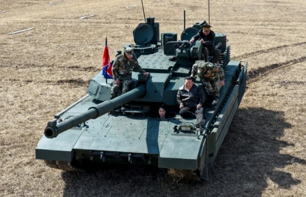 Kim Jong Un was captured in a photograph published by the Korean Central News Agency (KCNA), sitting atop a tank turret with the North Korean flag, while his daughter peeks out from the driver's hatch.