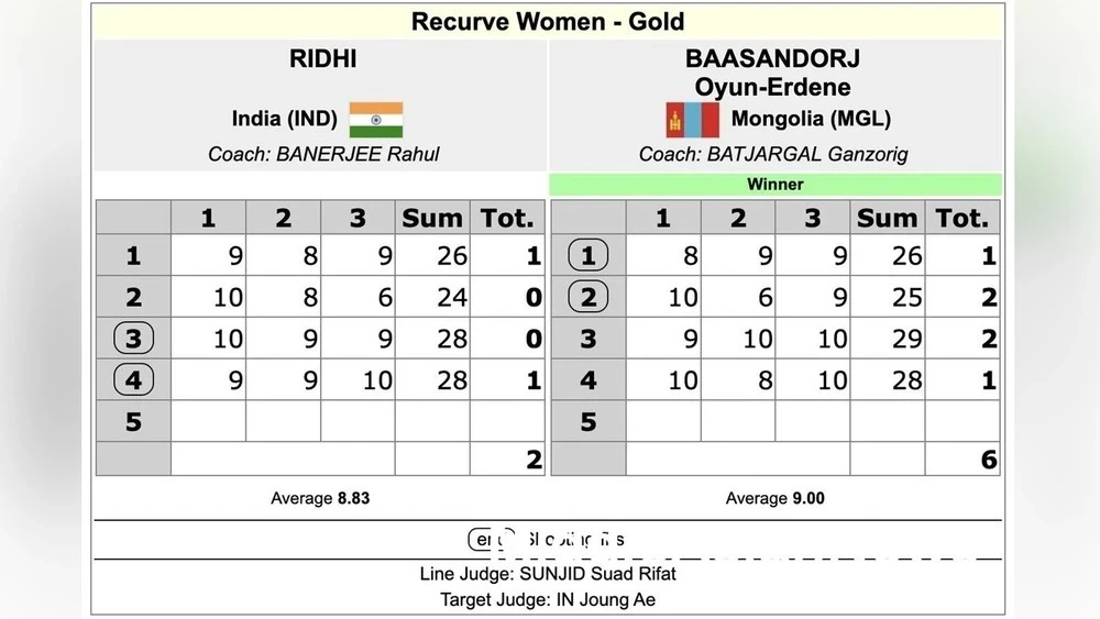 Oyun-Erdene Baasandorj became a two-time champion of the tournament, defeating Indian athlete Ridi For with a score of 6:2 in the individual women's classical archery competition.