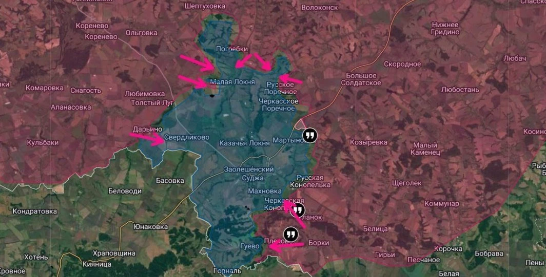 Российские бронегруппы смогли сильно продвинуться по дороге со стороны Новоивановки в направлении населенных пунктов Викторовка и Малая Локня, и заняли участок в лесопосадке возле села Кругленькое. По предварительной информации, уже идут бои за Викторовну, а как известно, это тыл Малой Локни и соответственно после ее взятия группировка противника будет полностью отрезана от снабжения.