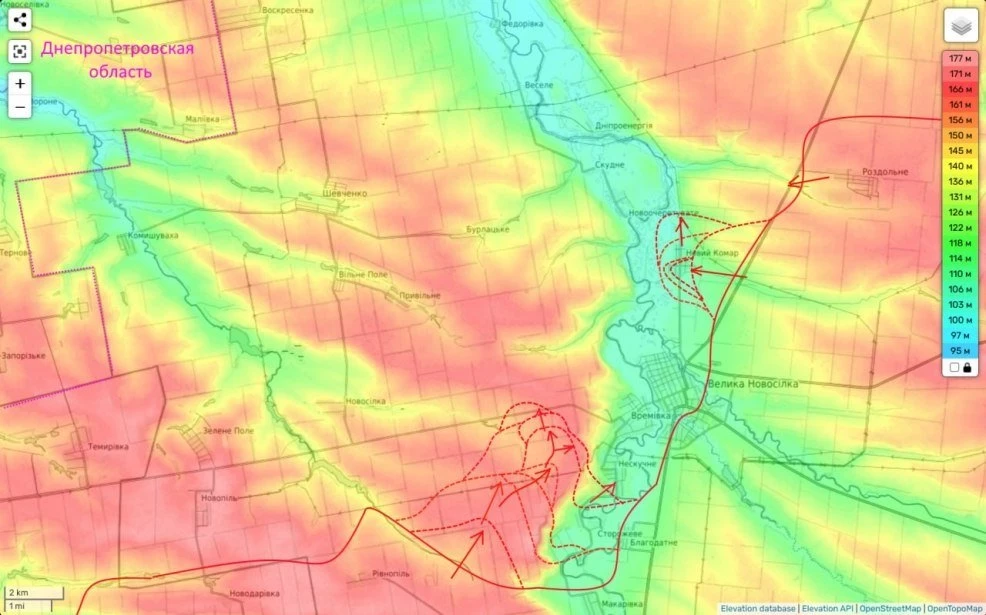 Между тем, занятие этих опорников несет для частей ВСУ в Большой Новосёлке массу серьёзных вызовов. Дело в том, что следующая хорошо оборудованная линия обороны противника находится довольно далеко на север и уже прикрывает не этот населённый пункт, а выход в Днепропетровскую область.