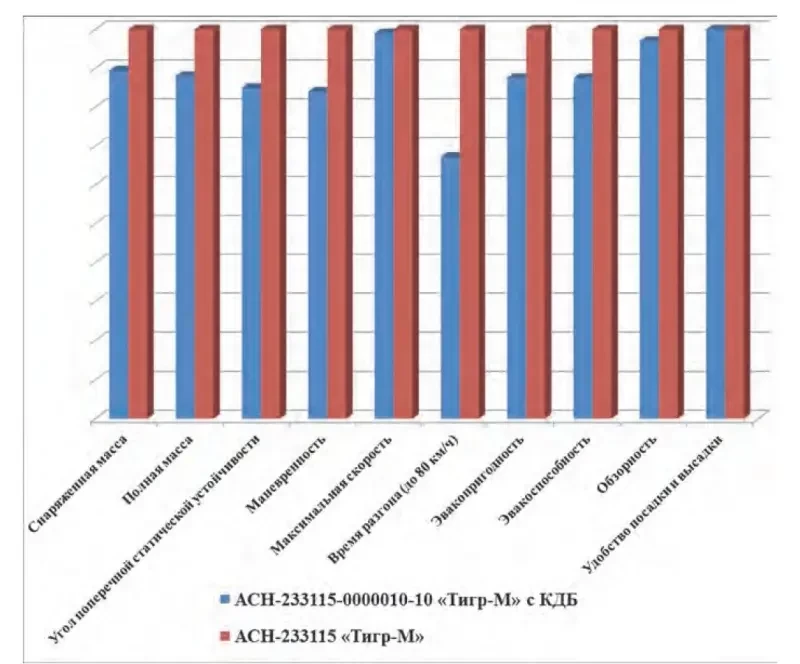 Сводная диаграмма результатов сравнительного анализа отдельных технических характеристик и эксплуатационных свойств автомобиля «Тигр-М» и «Тигр-М» с дополнительной броней. Источник: «Материально-техническое обеспечение Вооруженных Сил Российской Федерации», ноябрь 2024 года.