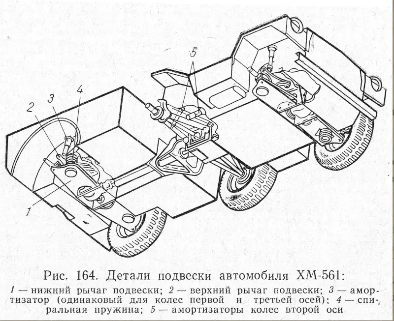 Подвеска ХМ561 была независимой с двойными поперечными рычагами. У колес передней и задней осей упругим элементом являлись пружины, колеса средней оси были подвешены на однолистовой поперечной рессоре.
