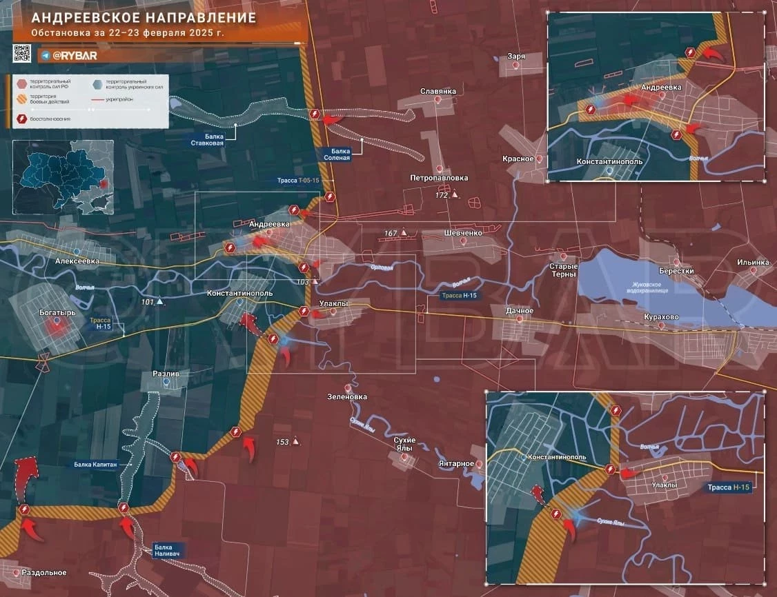 На Угледарском фронте ВС РФ обходят две линии обороны ВСУ на стыке ДНР и Запорожской обл, двигаются на север вдоль реки Мокрые Ялы, штурмуя Скудное и Днепроэнергию. Кроме этого, наши укрепляют фланги этого прорыва, слева атакуя на Бурлацкое и приближаясь к Привольному, а справа – на район Раздольного. Ближайшая цель ВС РФ - Федоровка, куда ВСУ тянут резервы. Вероятно, после того как будет взят Константинополь и Богатырь, две российские группировки встретятся на рубеже Комар-Мирное-Поддубное. Здесь будет решаться судьба Западного Донбасса. Кроме этого, на северо-запад от Поддубного идёт дорога на Искру, контроль над которым открывает путь в Днепропетровскую обл и позволяет обойти все рубежи обороны ВСУ на Запорожском фронте. МО подтвердило освобождение села Улаклы, откуда уже сутки наши эвакуируют гражданских - люди сидели под отстрелами, чтобы дождаться прихода российских военных. Севернее наши бойцы, двигаясь на запад от Андреевки, захватили важный опорный пункт и зашли на окраины Алексеевки.