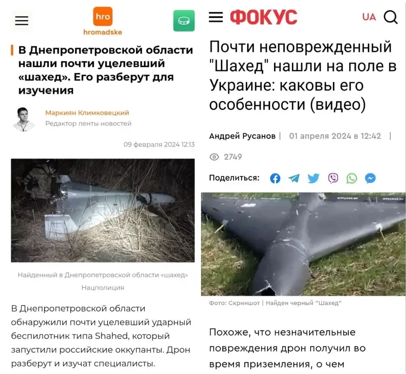 Например, автору потребовалось всего несколько минут на то, чтобы найти в сети Интернет несколько случаев падения БПЛА-камикадзе «Герань-2» на территории Украины без детонации боевой части (БЧ), да и вообще без каких-либо видимых повреждений.