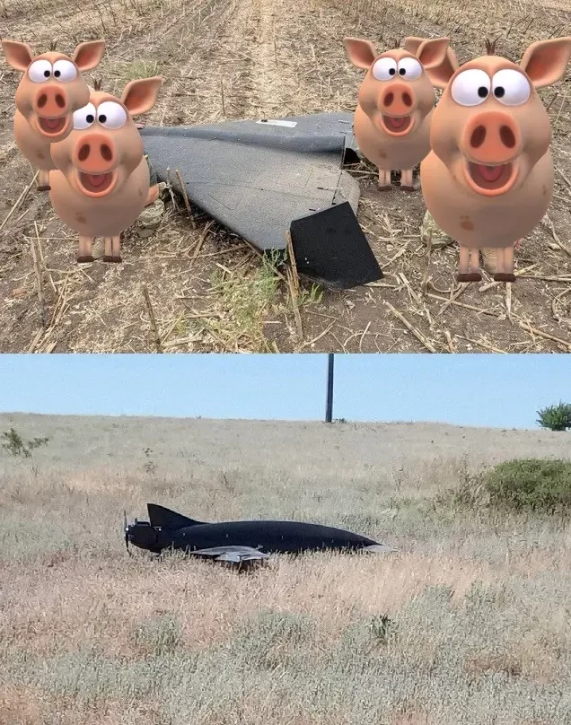 Вместе с «Геранями» идут несколько БПЛА, визуально очень напоминающие украинские БПЛА-камикадзе «Бобр». Картинно падает одна «Герань», чтобы журналисты могли рассмотреть её получше, а рядом «плюхается» «Бобр». Занавес.