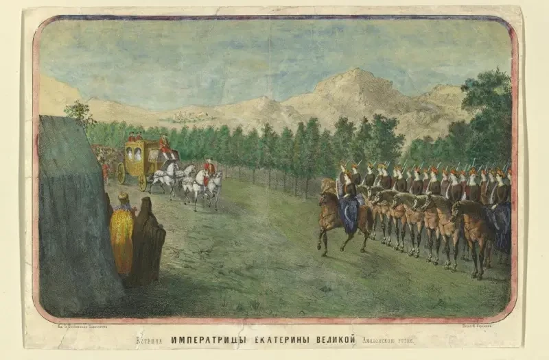 Н. Седов. Изображение встречи Екатерины II амазонскою ротой во время ее поездки в Крым в 1787 г.