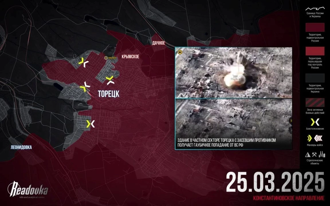 В Торецкой агломерации противник активно применяет дроны и сковывает свободу передвижения у наших войск. У армии России есть тактические успехи в северной части города. На фоне общей стагнации ситуации в Торецке, оживает фронт к юго-западу от города. После вчерашнего штурма Александрополя (Розовки) ВС РФ на плечах противника ворвались в Пантелеймоновку и, по некоторым данным, уже зачищают и её. Сообщают, что к северу от Керамика штурмовики продвинулись на 600 м вглубь обороны противника.