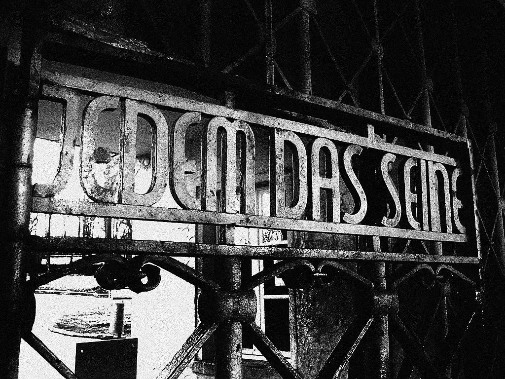 Надпись на воротах концлагеря Бухенвальд «Jedem das Seine» - дословно «каждому свое» (означает «каждый получает то, что заслуживает»)