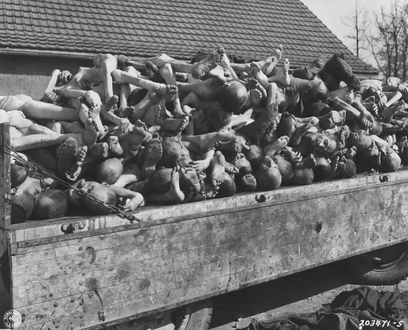 Трупы узников концентрационного лагеря Бухенвальд, приготовленные для сжигания в крематории, в кузове прицепа. Апрель 1945