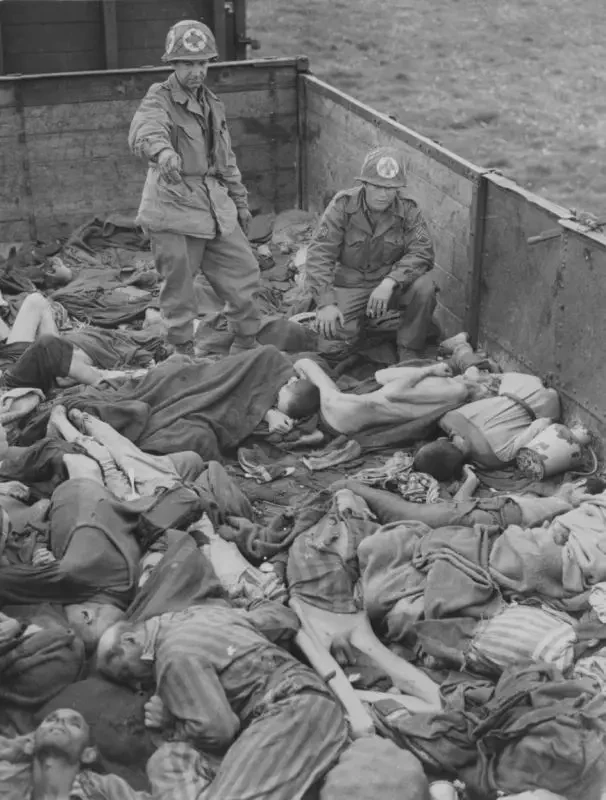 Медики 45-й пехотной дивизии 7-й американской армии в вагоне с телами погибших узников из концлагеря Бухенвальд. Узники погибли в так называемом «поезде смерти», когда их перевозили в концлагерь Дахау. При освобождении концлагеря Дахау американские войска обнаружили поезд, в котором находились тела около 2300 погибших узников.