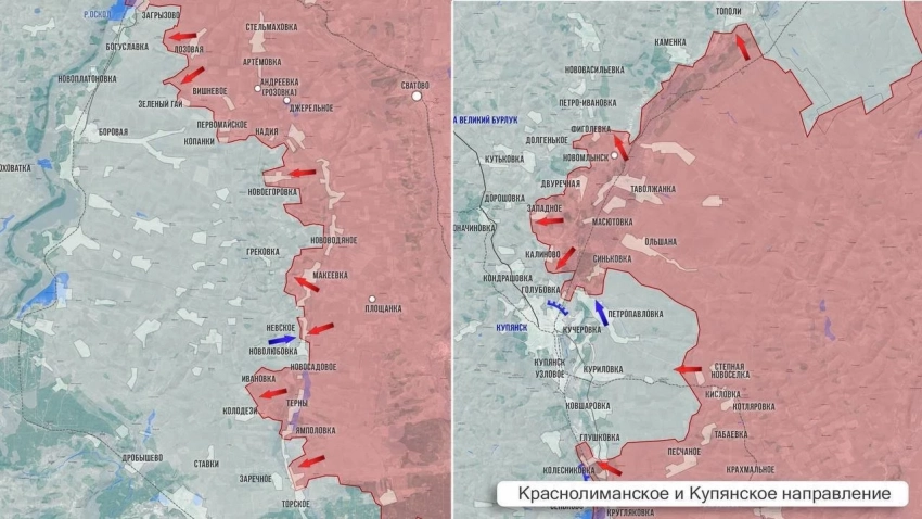 На Купянском направлении ВС РФ пробиваются в районе Степовой Новосёловки. Севернее по фронту наши укрепляют плацдарм за Осколом, который сейчас составляет примерно 34 км в ширину и до 4 км в глубину. В ближайшее время ВС РФ могут усилить давление на Купянск, обогнув реку. В долгосрочной перспективе позиции на западном берегу Оскола могут быть использованы для наступления на Харьков.