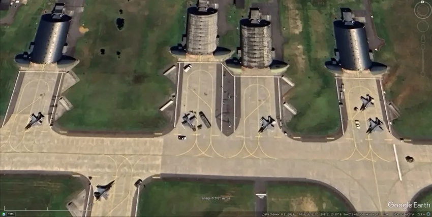 Спутниковый снимок Google Earth: укрытия рядом со стоянкой истребителей-бомбардировщиков F-15E на авиабазе Лейкенхит