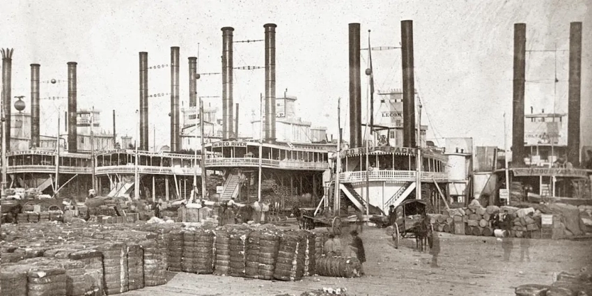 Цветная открытка того времени изображающая пароход «Роберт. Е. Ли» поставленный под погрузку кип хлопка