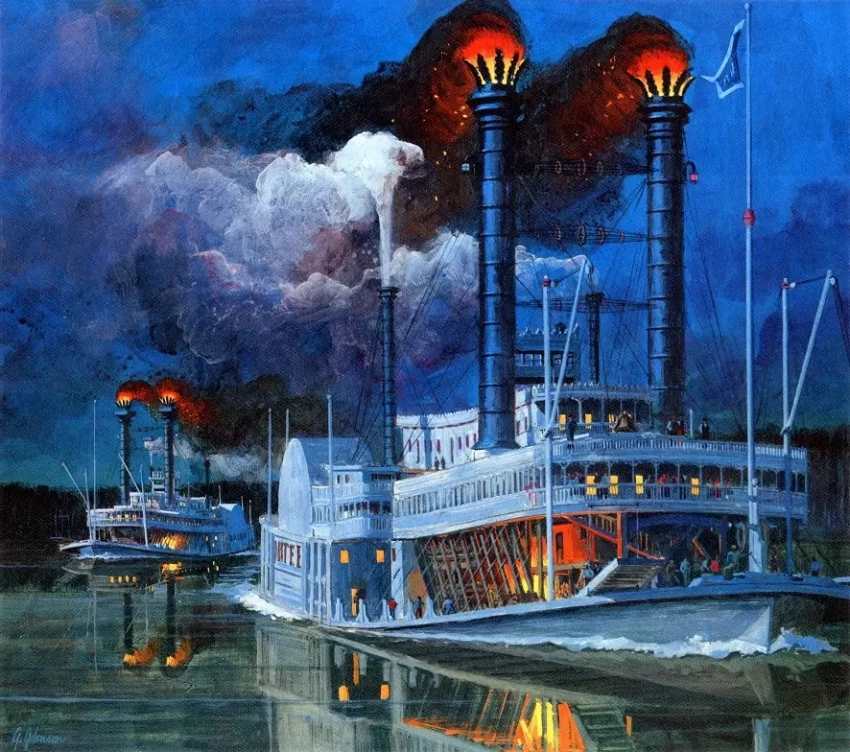 Состязание в скорости 1870 г. между пароходами «Натчез» и «Роберт Э. Ли». Работа Гордона Джонсона для журнала «Атлантик Иншуранс» 1960-х годов. Возможно, на него повлияла картина Дина Корнуэлла, также изобразившего гонку этих пароходов…
