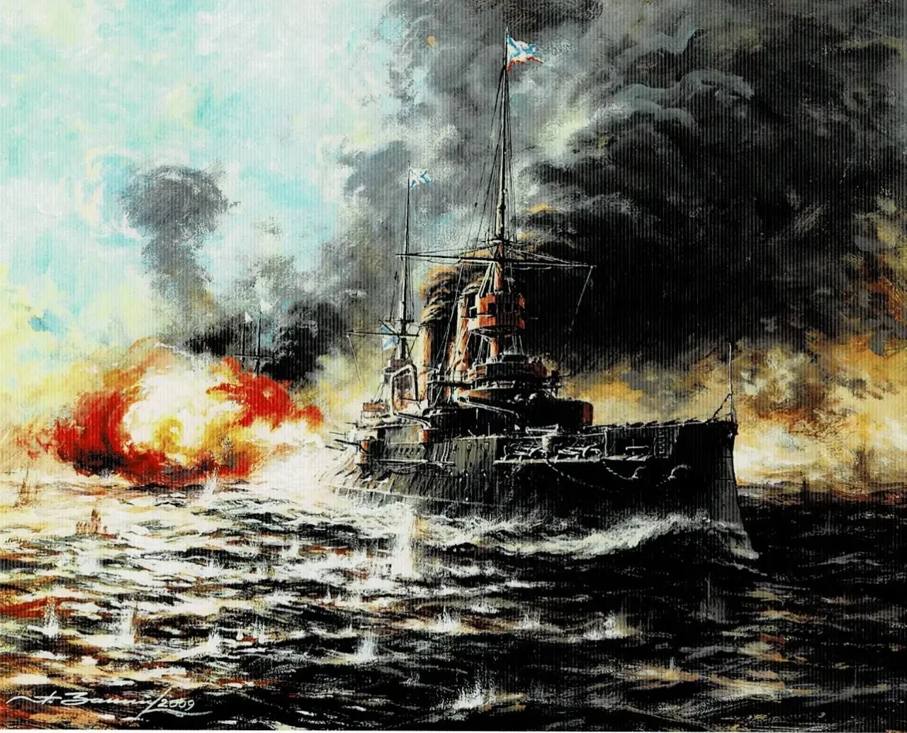 13. «Цесаревич» в бою о Порт-Артура 28.7.1904 г. Бумага, темпера, гуашь, 43х54 см. 2009 г.