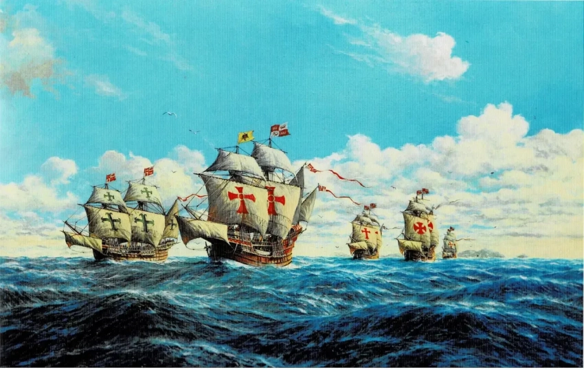 3. К Островам Пряностей. Эскадра Фернана ди Магальяниша у Канарских островов. 1519 г. Холст, темпера, акрил, 60х90 см. 2019 г.