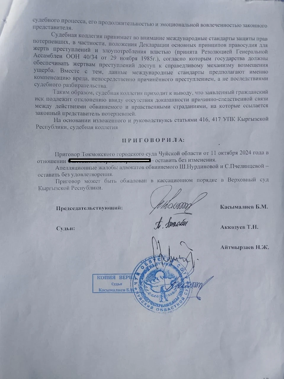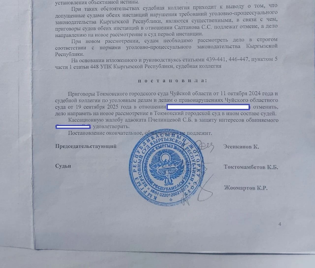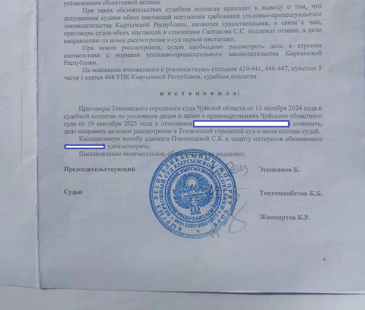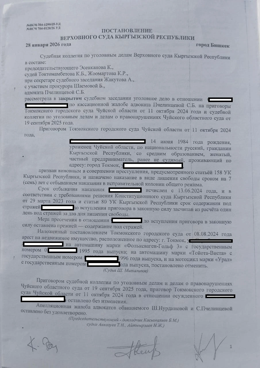 «Суды первой инстанции длились около полугода, и в итоге его осудили на семь лет по статьям 158 (развратные действия) и 34 (продолжаемое преступление). За это время у ответчика сменилось три адвоката, а нас защищает государственный адвокат. Они подали апелляцию в областной суд, и было более 12 заседаний, на одном из которых полностью сменился состав судей. В итоге областной суд оставил приговор без изменений. С.С. был направлен в колонию № 10 в Джалал-Абаде, где провел всего несколько месяцев, после чего его адвокат подал кассацию в Верховный суд с просьбой отменить приговор», — продолжила Лина.