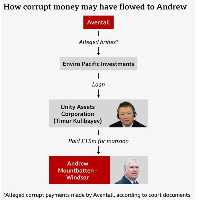 «Би-би-си» тарабынан жүргүзүлгөн тергөөдө, Эндрю Маунтбаттен-Виндзор казак олигархы тарабынан коррупцияда айыпталган фирмадан чоң сумма алгандыгы аныкталды.