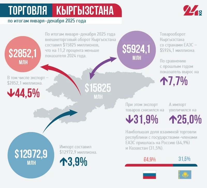 Кыргызстандын Улуттук статистика комитетинин маалыматына ылайык, 2025-жылы Кыргызстандын тышкы соода жүгүртүүсүнүн жалпы суммасы $15 миллиард 825 миллионду түзүп, 2024-жылга салыштырганда 11,2%га төмөндөгөн.