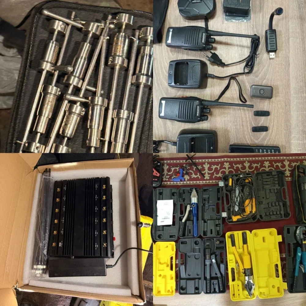 Ошондой эле АКСУ автомат, 30 патрону бар magasin, Макаров пистолети, 20 9 мм калибрдеги ок, травматикалык пистолет, Ф-1 кол гранатасы, бычактар жана наркотикалык заттар табылган.