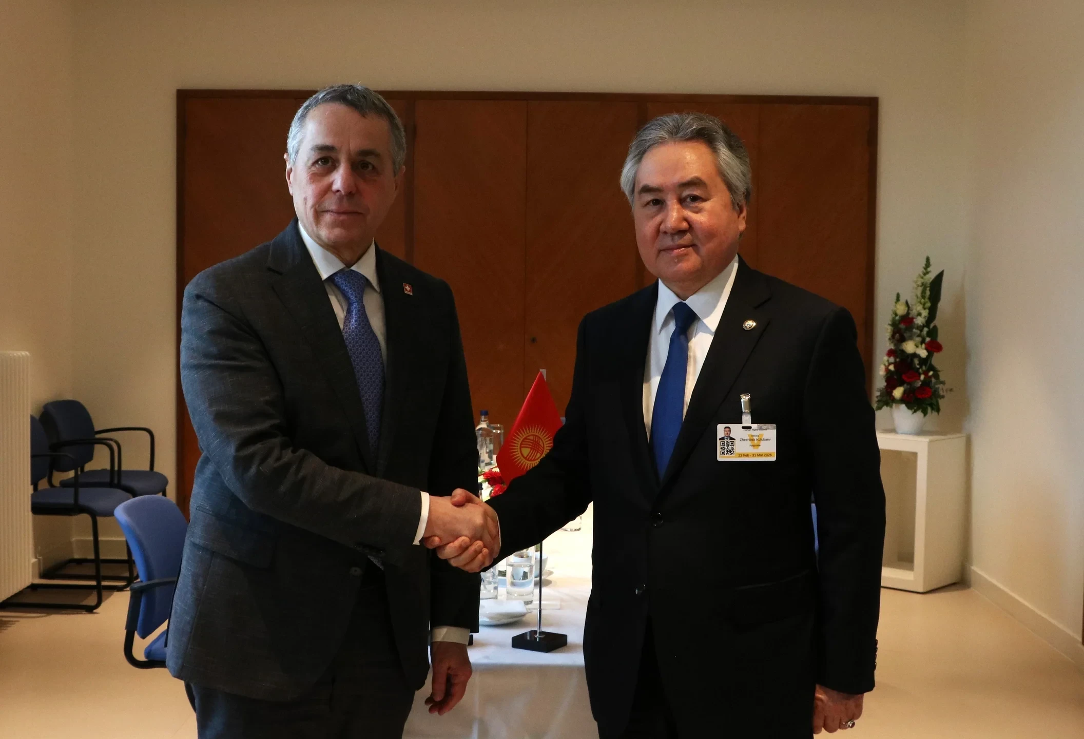 2026-жылдын 23-февралында Женевада Кыргыз Республикасынын Тышкы иштер министри Жээнбек Кулубаев менен Швейцариянын Федералдык тышкы иштер департаментинин башчысы Иньяцио Кассистин ортосунда жолугушуу өттү. Бул жолугушуу БУУнун Адам укуктары боюнча 61-сессиясынын жогорку деңгээлдеги алкагында өттү, деп билдирет КР Тышкы иштер министрлигинин басма сөз кызматы.