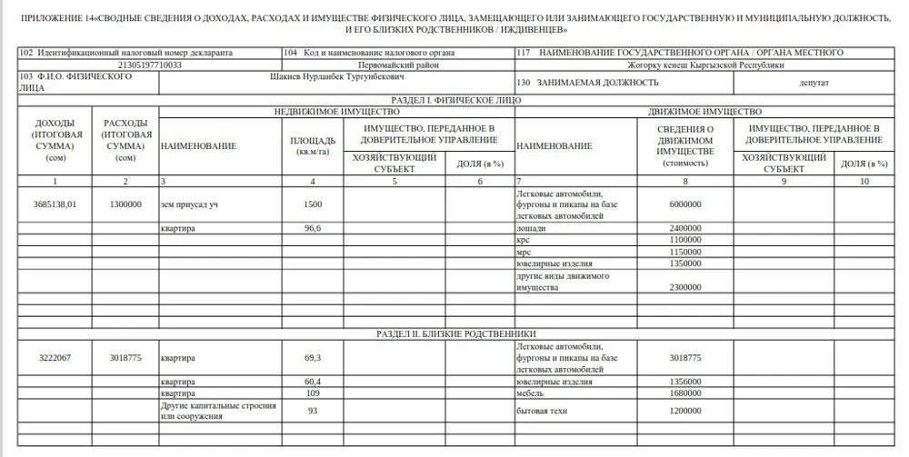 Декларация — 2024. Торага ЖК 6 миллион сомдук кыймылдуу мүлккө ээ.