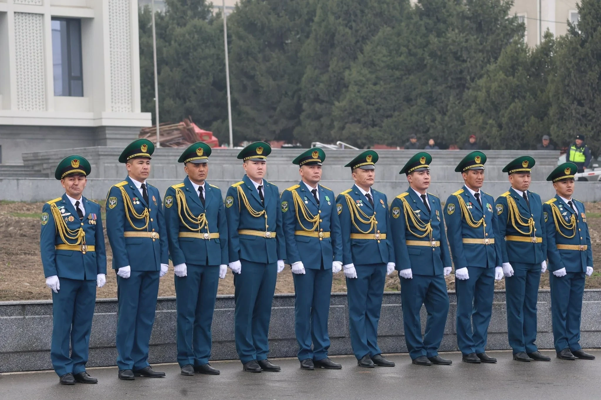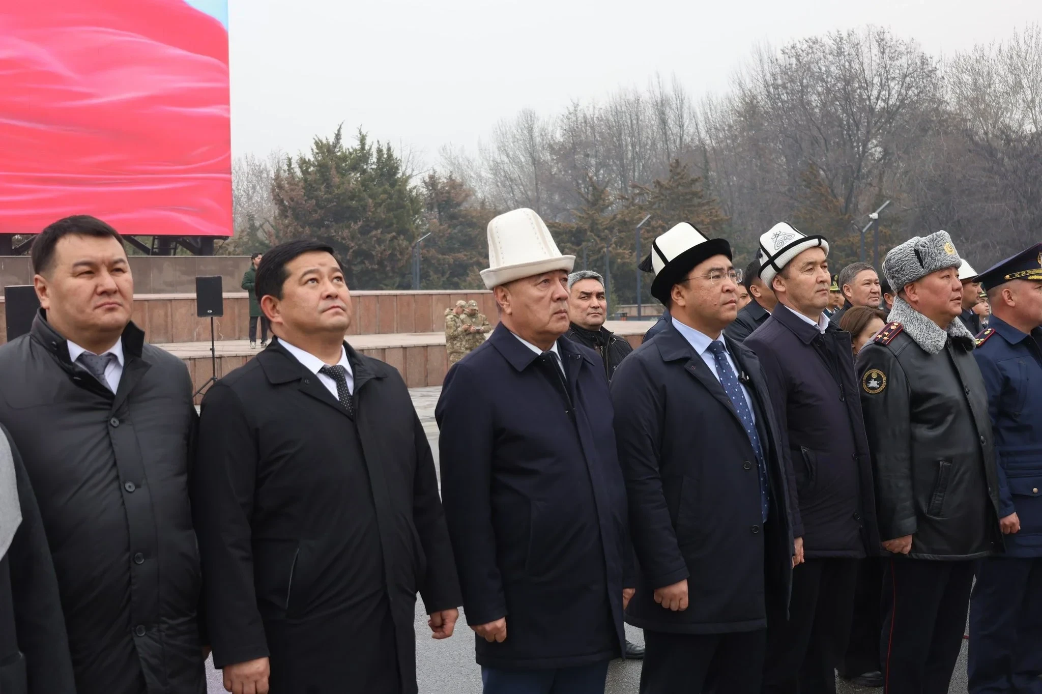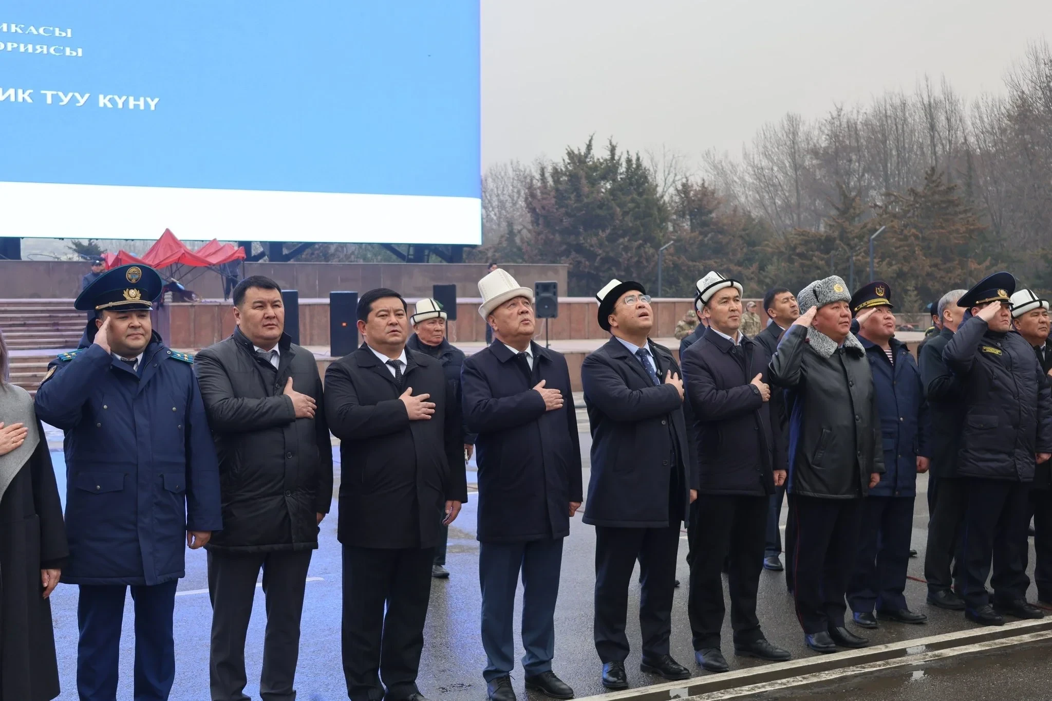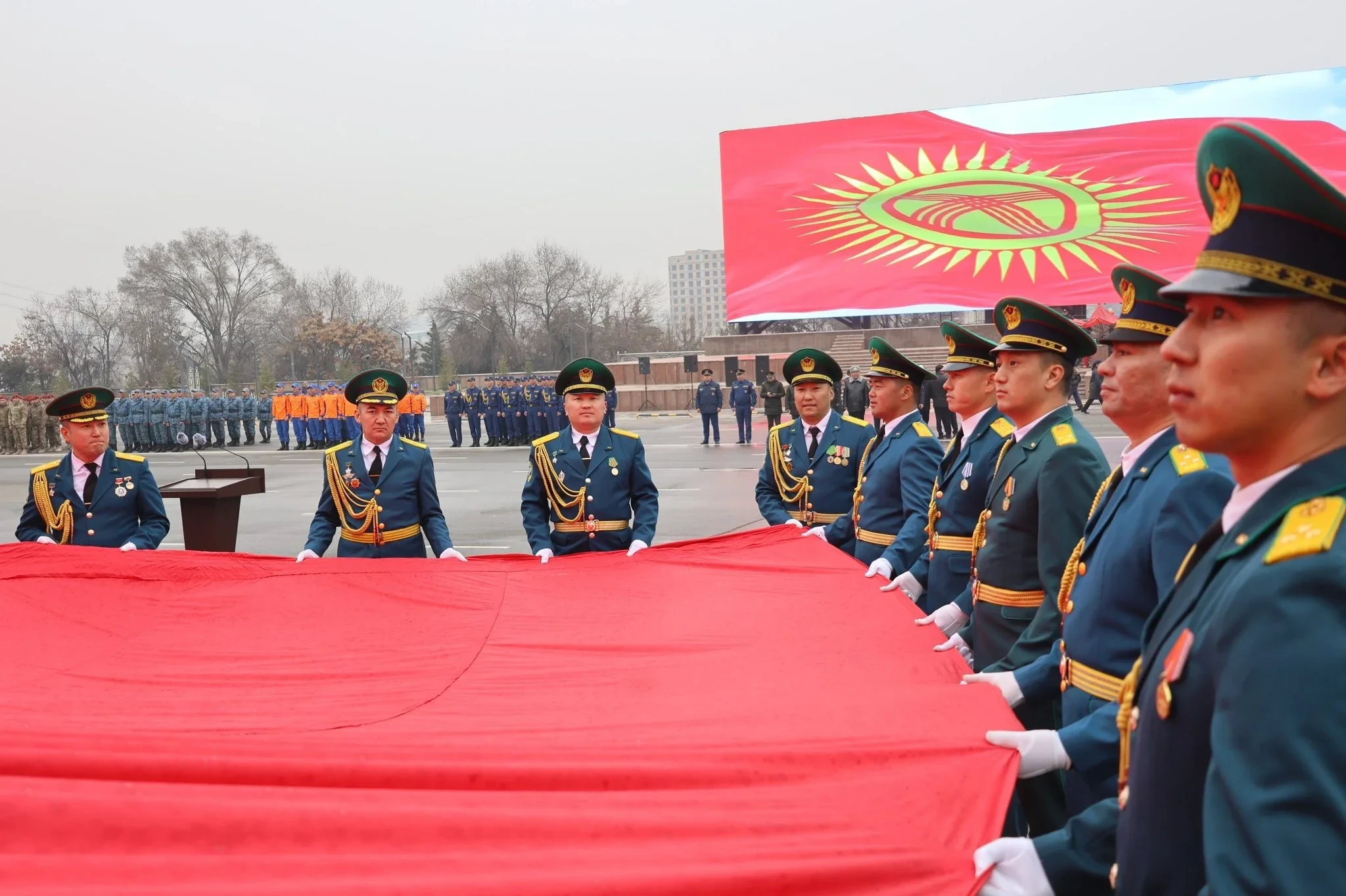 Иш-чаранын учурунда аскер кызматкерлери борбордук аянтта Кыргыз Республикасынын гимнинин коштоосунда мамлекеттик тууну көтөрүштү.