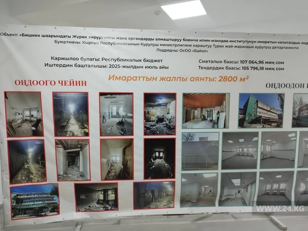Жүрөк хирургиясы жана органдарды трансплантациялоо боюнча илимий-изилдөө институту (НИИХСиТО) 2025-жылдын февраль айында болгон өрттөн кийин чектелген мейкиндикте бир жылдан ашык убакыттан бери иштеп жатат. Убакыттуу бөлүмдөр Республикалык диагностикалык борбордо жана Улуттук ооруканада уюштурулган. Институттун өз имаратында капиталдык ремонт аяктоого жакын, кызматкерлер кайтып келүүгө даярданышууда.