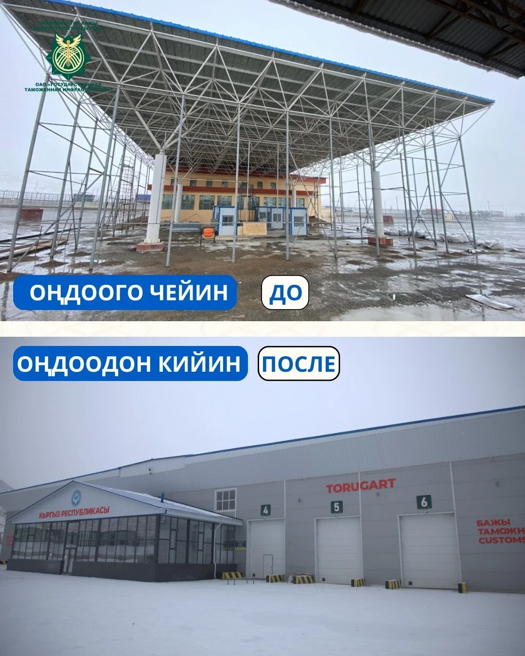 «Торугарт» КППда инспекционно-текшерүү комплексин куруу жана административдик имараттарды реконструкциялоо иштери да жүрүп жатат. Чет өлкөлөр менен экономикалык ишмердүүлүк жүргүзгөндөр үчүн жаңы ыңгайлуу күтүү залы ачылды, бул жүк өткөрүү процедурасын тездетүүгө жана өлкөнүн транзиттик потенциалын жогорулатууга жардам берет, деп белгилешти «Мамлекеттик бажы инфратүзүмү» акционердик коомунда.