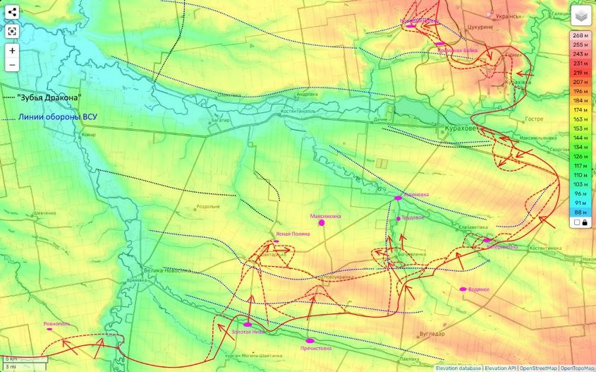 А вот на Кураховском направлении, удар идет в лоб. И последняя из них проходит южнее Шахтерского, севернее Новоукраинки (на высотах за селом), южнее Богоявленки.