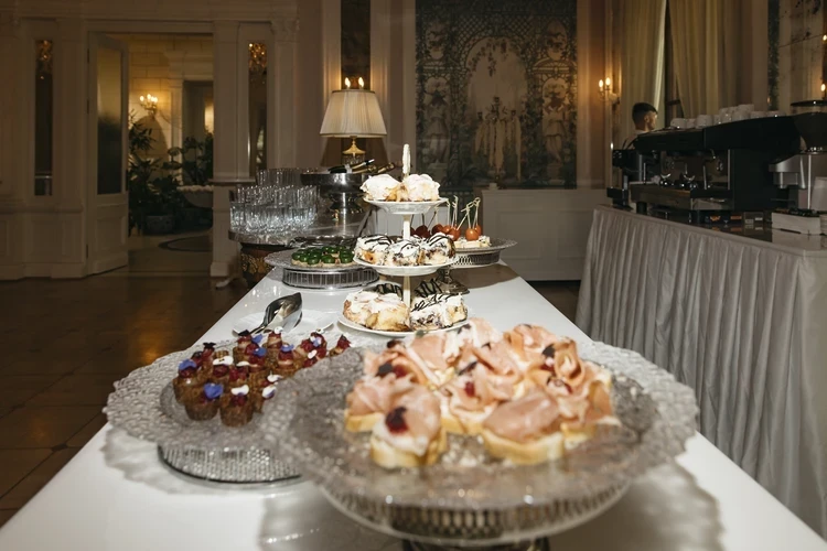 В общем, банкет в честь жениха и невесты был нестандартный. Даже подачу блюд организовали не как принято. Официанты в белых перчатках сперва угощали гостей закусками и приветственными коктейлем, а также шампанским. В основном рыба и паштеты. Затем был ужин.