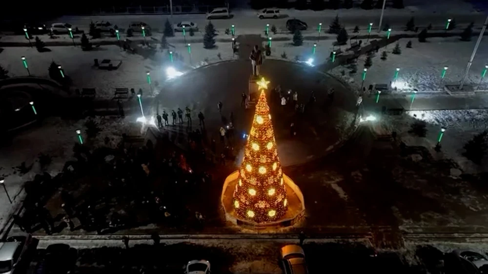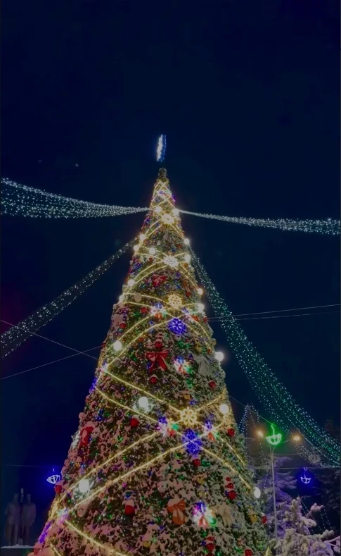 В Токмоке также установлена новогодняя елка, которая украшена длинными гирляндами, создающими атмосферу праздника.