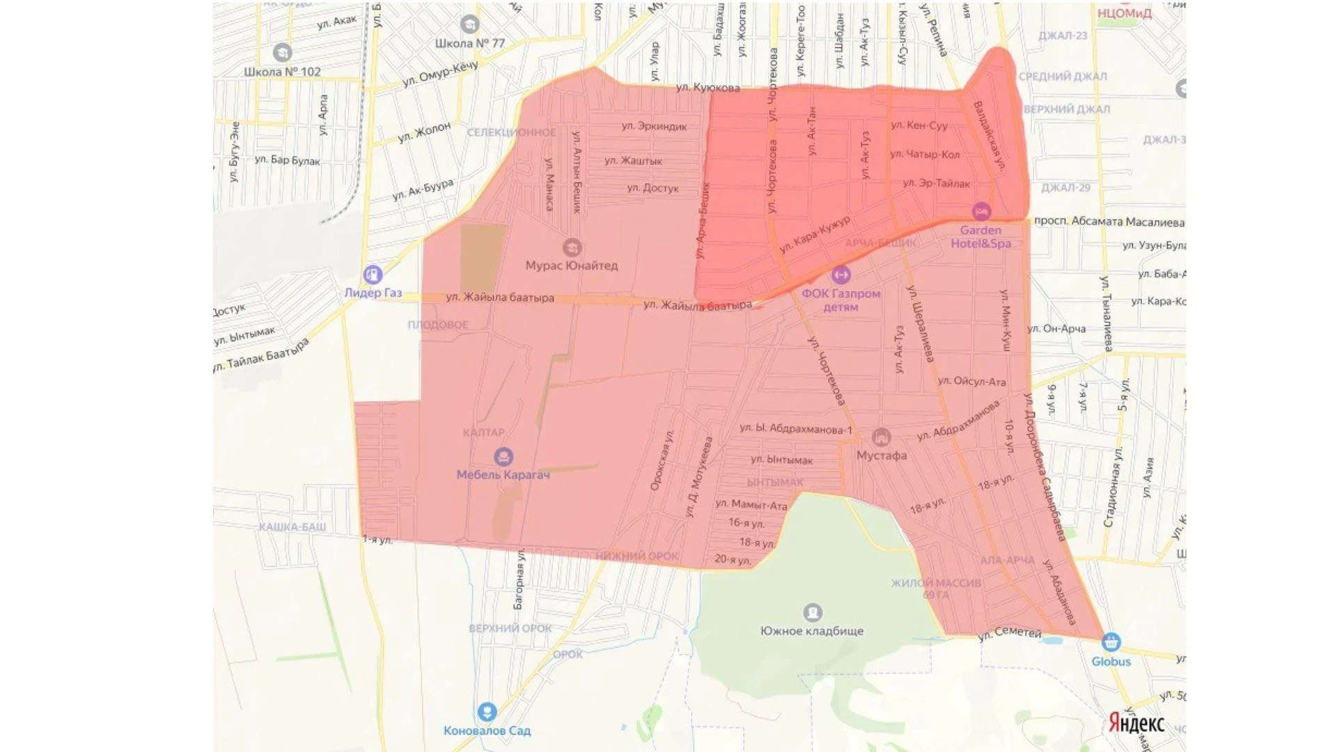 Отключение коснётся южной части жилого массива «Арча-Бешик», а также улиц Семетей, Садырбаева, Жайыла Баатыра, Селекционной, Арча-Бешик, Куюкова, Эр-Тайлак, Кен-Суу, Чатыр-Куль, Кара-Кужур, Ак-Тан, Ак-Туз, Валдайской и трассы, ведущей к селу Джал.