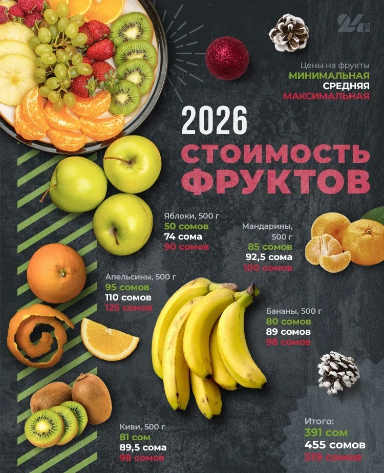 Если же вы планируете взять по полкилограмма каждого вида фруктов, то на новогодние расходы потребуется дополнительно около 400-550 сомов. Это примерно соответствует уровню цен прошлого года.