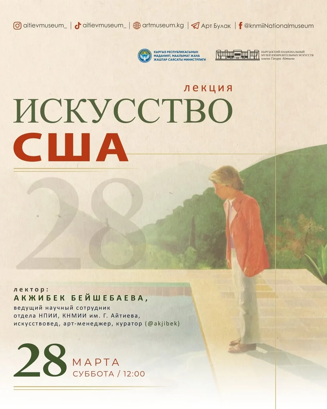Темой лекции станет искусство США. Ведущий: искусствовед и арт-менеджер Акжибек Бейшебаева.