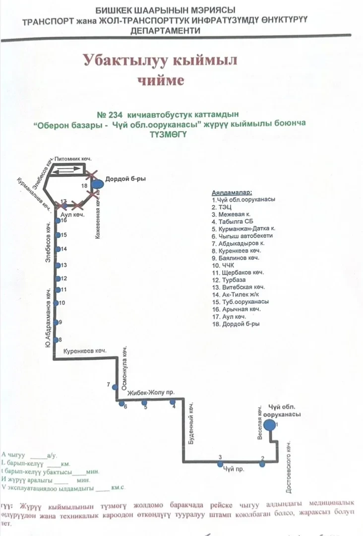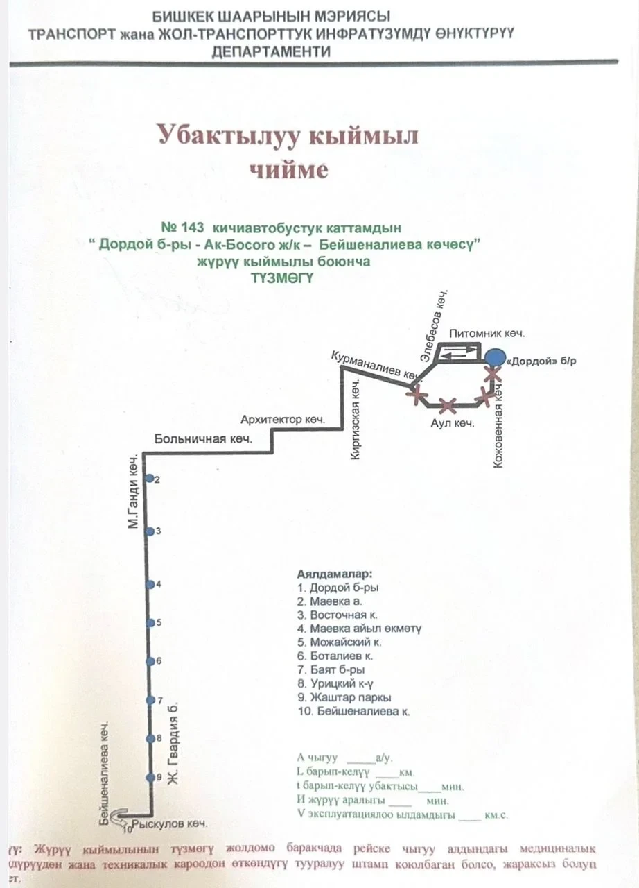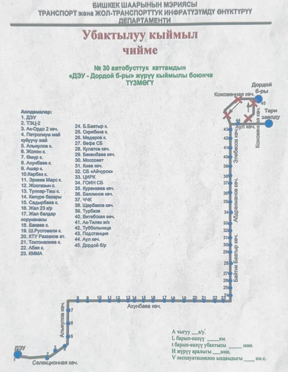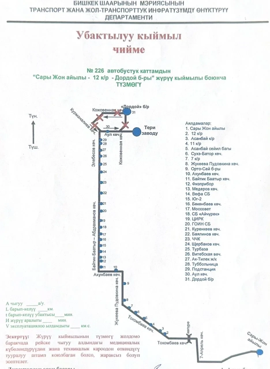 В мэрии города сообщили о временных изменениях в работе 7 маршрутов: №30, №226 и №203 для автобусов муниципального предприятия «Бишкекский городской транспорт», а также микроавтобусов №143, №161, №234 и №130.