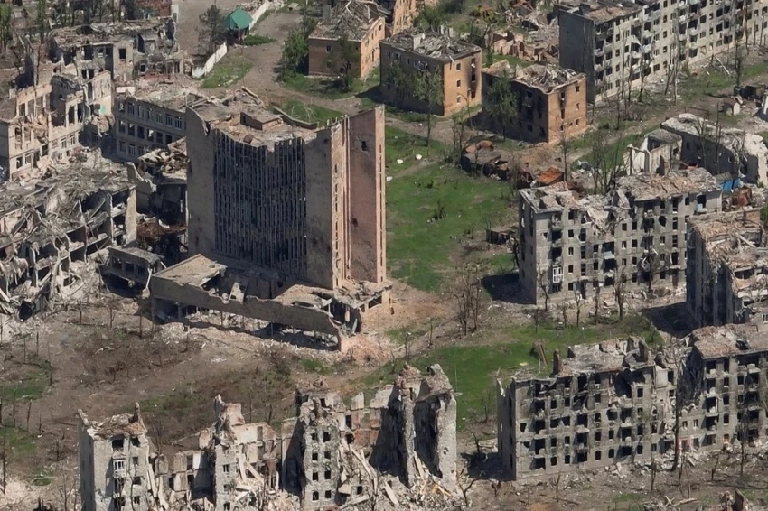 Вид с воздуха на разрушенный Артемовск (Бахмут), Донецкая народная республика (ДНР), Россия